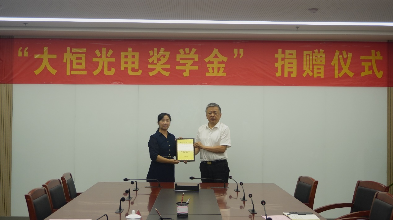 大恒光电捐赠人民币20万元,在beat365平台唯一官网设立“大恒光电奖学金”。吴玉程代表学校向大恒光电颁发了捐赠证书。