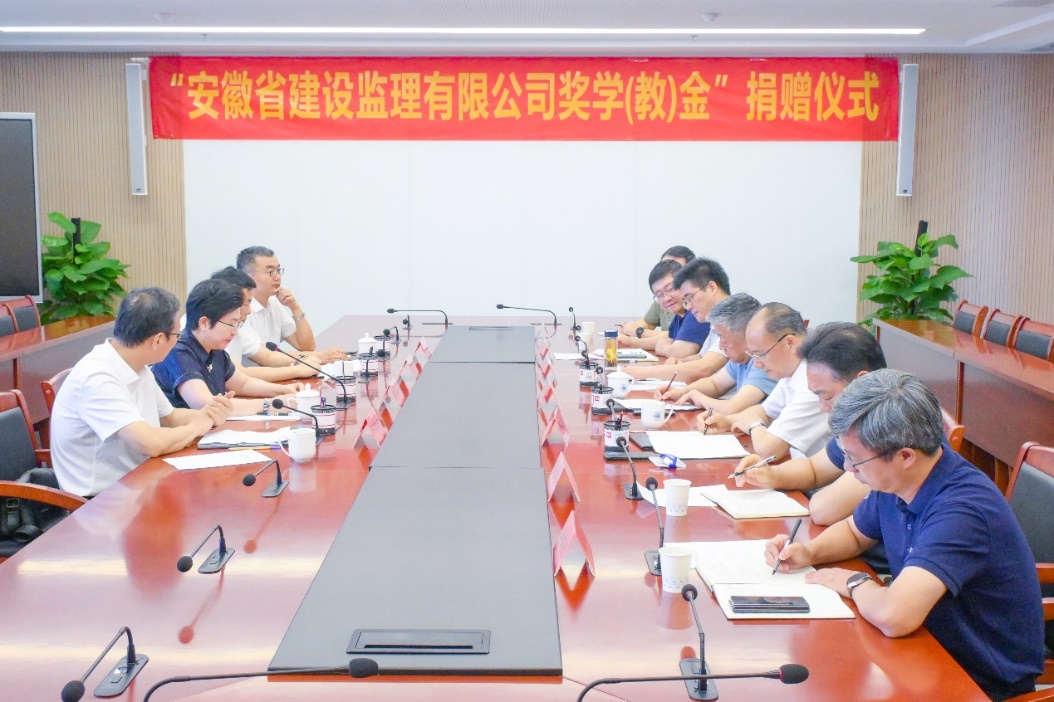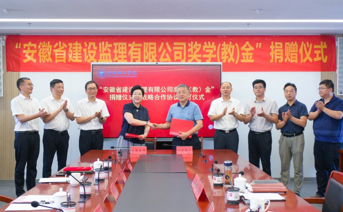 2025年9月17日,“安徽省建设监理有限公司奖学(教)金”捐赠暨校企战略合作协议签订仪式在beat365官网行政综合楼第一会议室举行。校党委副书记、校长吴玉程,校筹备组副主任吴明在,安徽省建设监理有限公司(以下简称“安徽监理”)总经理朱仁芳、副总经理苏立新、副总经理陈永新、总经理助理王新闻出席捐赠和签约活动,仪式由校党委副书记、副校长李先强主持。