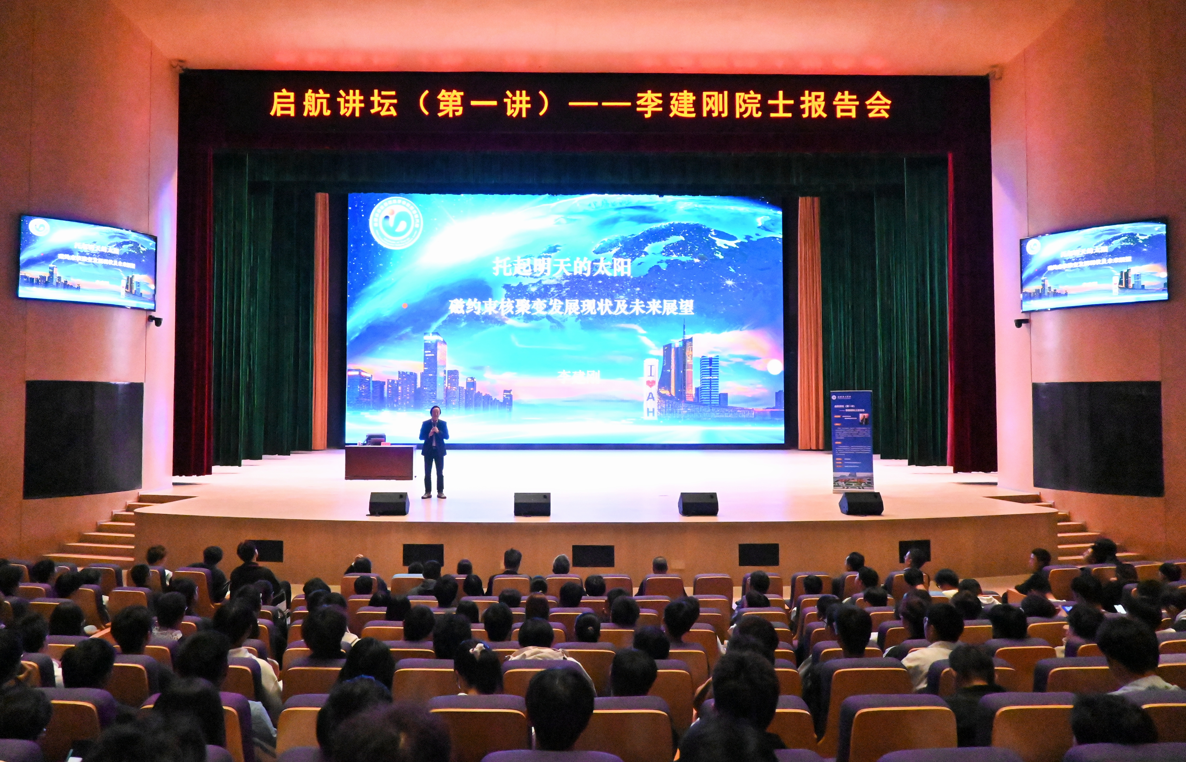 2025年10月29日下午,beat365官网在文化艺术中心举办“启航讲坛”首场活动。特邀中国工程院院士、合肥综合性国家科学中心能源研究院李建刚教授来校作《托起明天的太阳——磁约束聚变现状及发展》学术报告,全校师生和在校领导参加了报告会。报告会由校党委副书记、校长吴玉程教授主持。