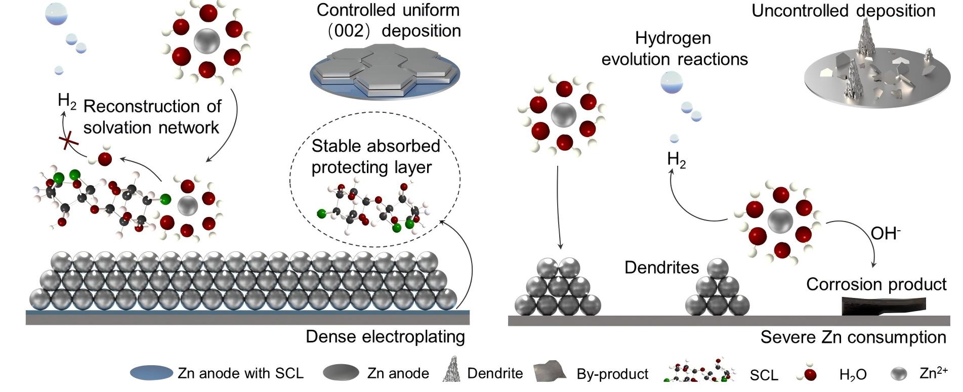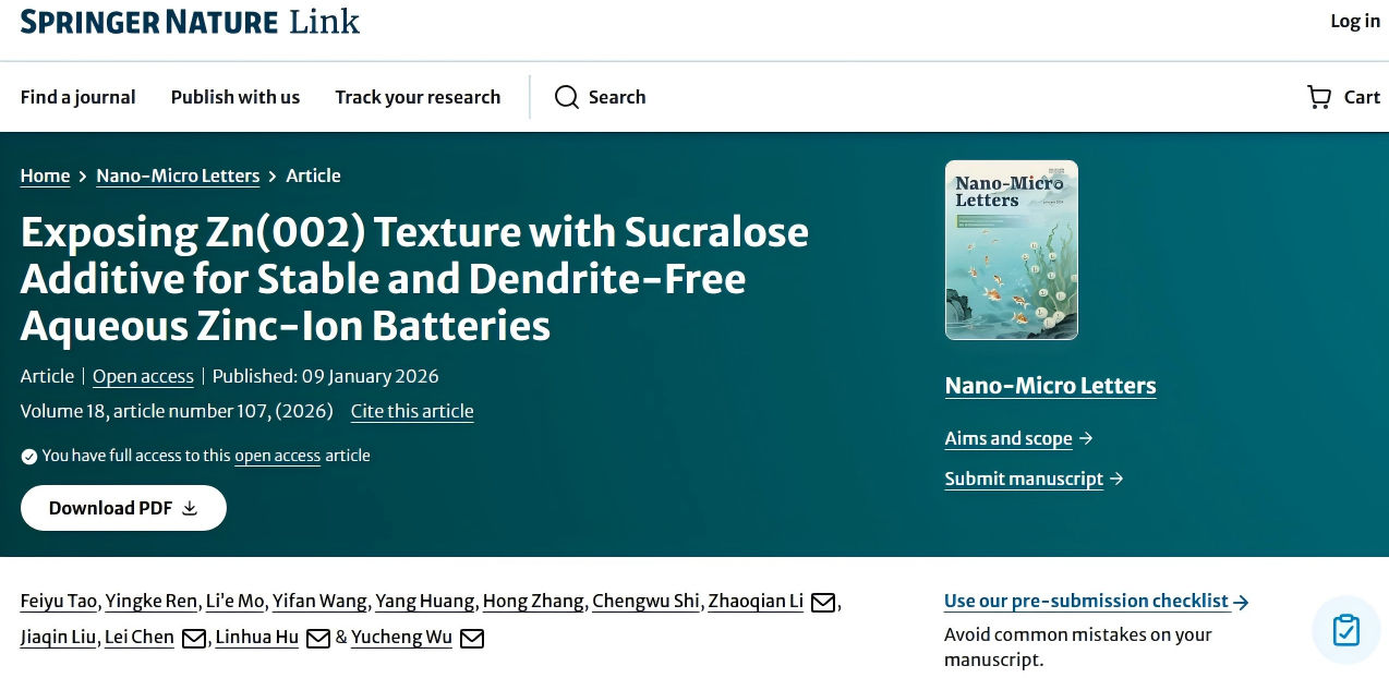 近日,beat365官网校长吴玉程教授团队李兆乾副研究员在水系锌离子电池电解液研究方面取得新进展。研究人员在水系锌盐电解液中引入三氯蔗糖,实现锌(002)面择优取向生长,有效抑制了锌枝晶生长,极大提升了电池充放电可逆性和循环稳定性能。相关成果发表在国际期刊Nano-Micro Letters(2024年影响因子IF=36.3)。