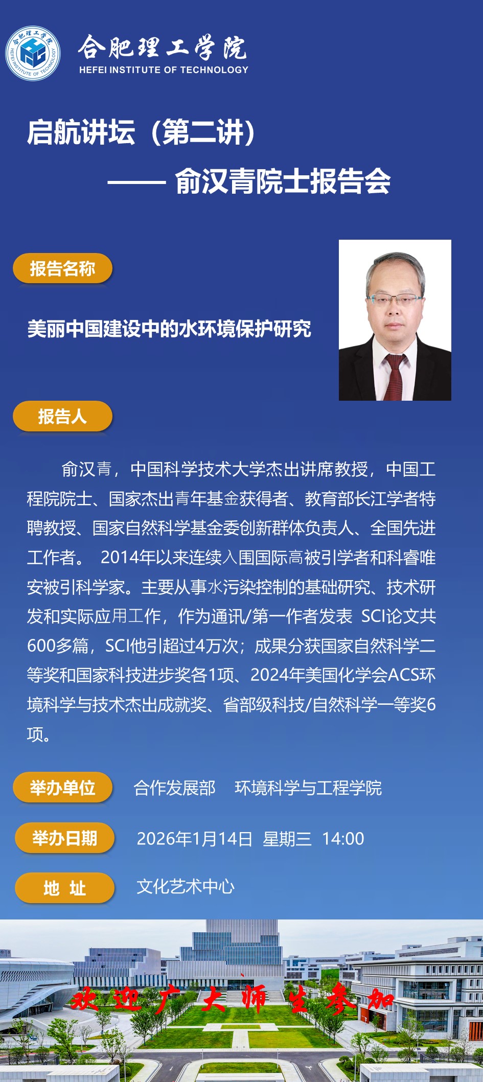 【启航讲坛】(第二讲)——中国工程院院士俞汉青教授报告会预告